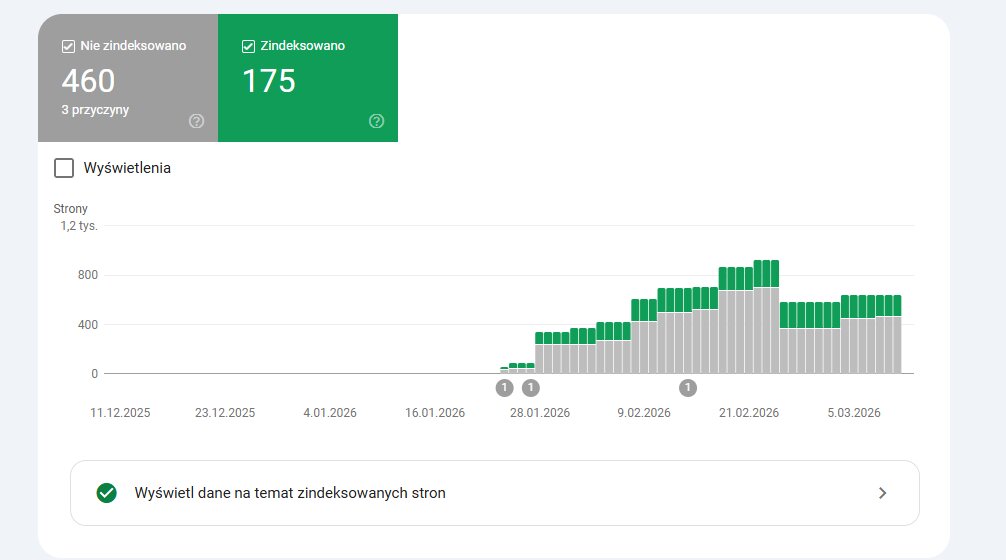 Obecnie mamy 175 w pełni widocznych podstron, które już teraz generują ruch. Liczba 460 stron jeszcze niezindeksowanych nie powinna niepokoić – to naturalny proces w przypadku nowej domeny o tak dużej dynamice przyrostu treści. Większość z nich to zasób, który wkrótce zasili nasze statystyki wyświetleń.